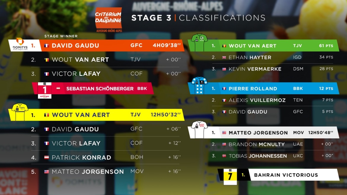 赛后,范阿尔特重新穿上总成绩黄衫,保有冲刺绿衫,罗兰扩大了爬坡圆点衫领先优势,乔根森(移动之星)成为新的最佳年轻车手白衫拥有者。