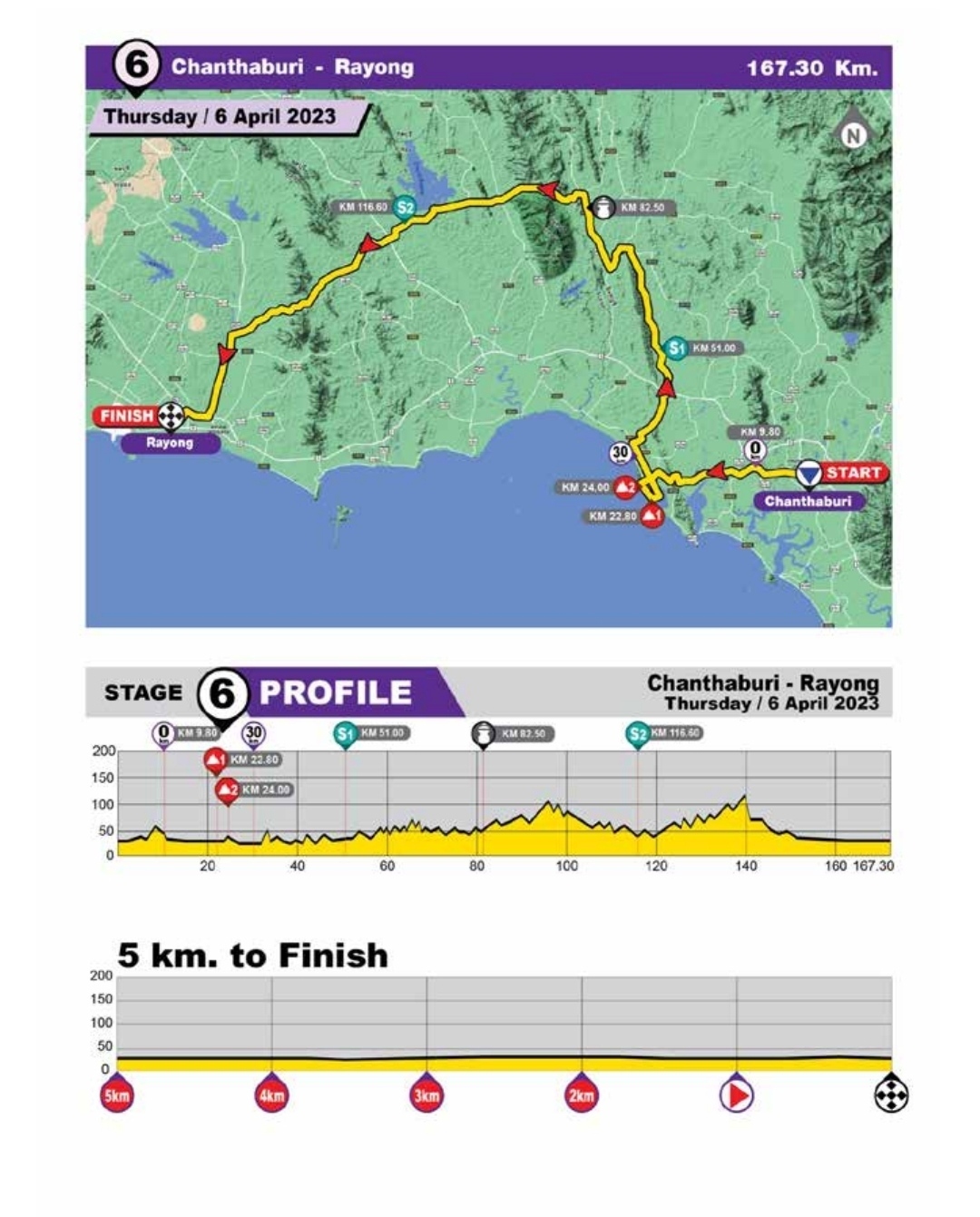 本场比赛赛程167公里,从庄他武里向西出发前往罗勇府,途中没有较高的山,预计很可能出现小概率突围致胜和大概率集团冲刺收尾的结局。