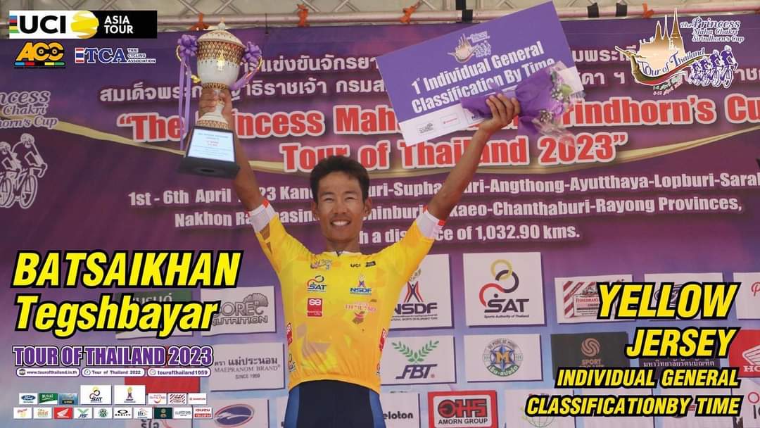 黄衫得主——巴赛汗,1998年6月1日出生于蒙古,以个人计时赛能力强出名,现效力于路佳车队。曾获得过2016年世少赛冠军、2019年亚锦赛亚军、2022年亚锦赛团体亚军。在环泰国S1,巴赛汗在比赛初期勇于突围,几乎是一个人“ITT”骑行120公里,打了所有参赛车队一个措手不及,由于大集团内没人带队追击,眼睁睁看着巴赛汗以领先大集团12分钟领先优势;领先追击集团40秒优势跑完全程,如果不出意外,本场比赛结束后他将问鼎总冠军。