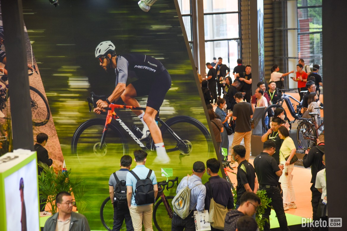 ▲美利达展位人头攒动,巨幅海报冲击力十足