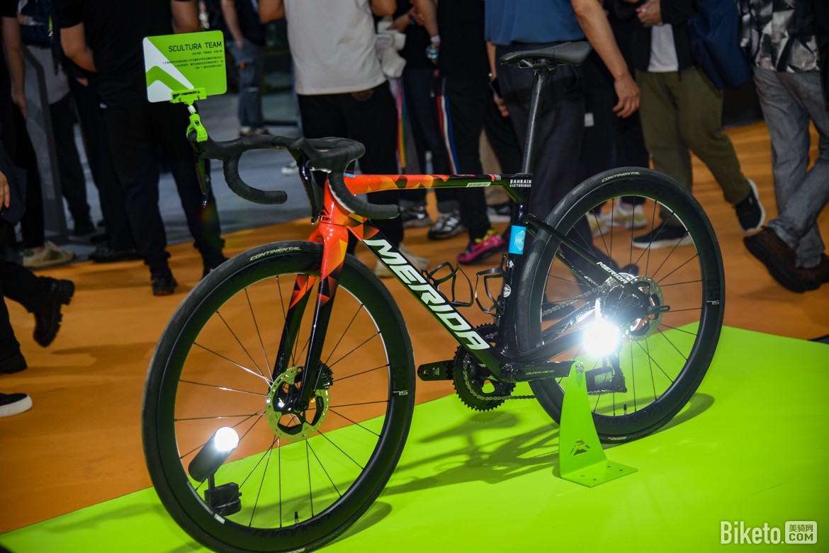 巴林胜利车队版涂装的美利达Scultura Team公路车被展放在站台中央,为车队多次赢得世界巡回赛冠军的御用战驹值得C位。