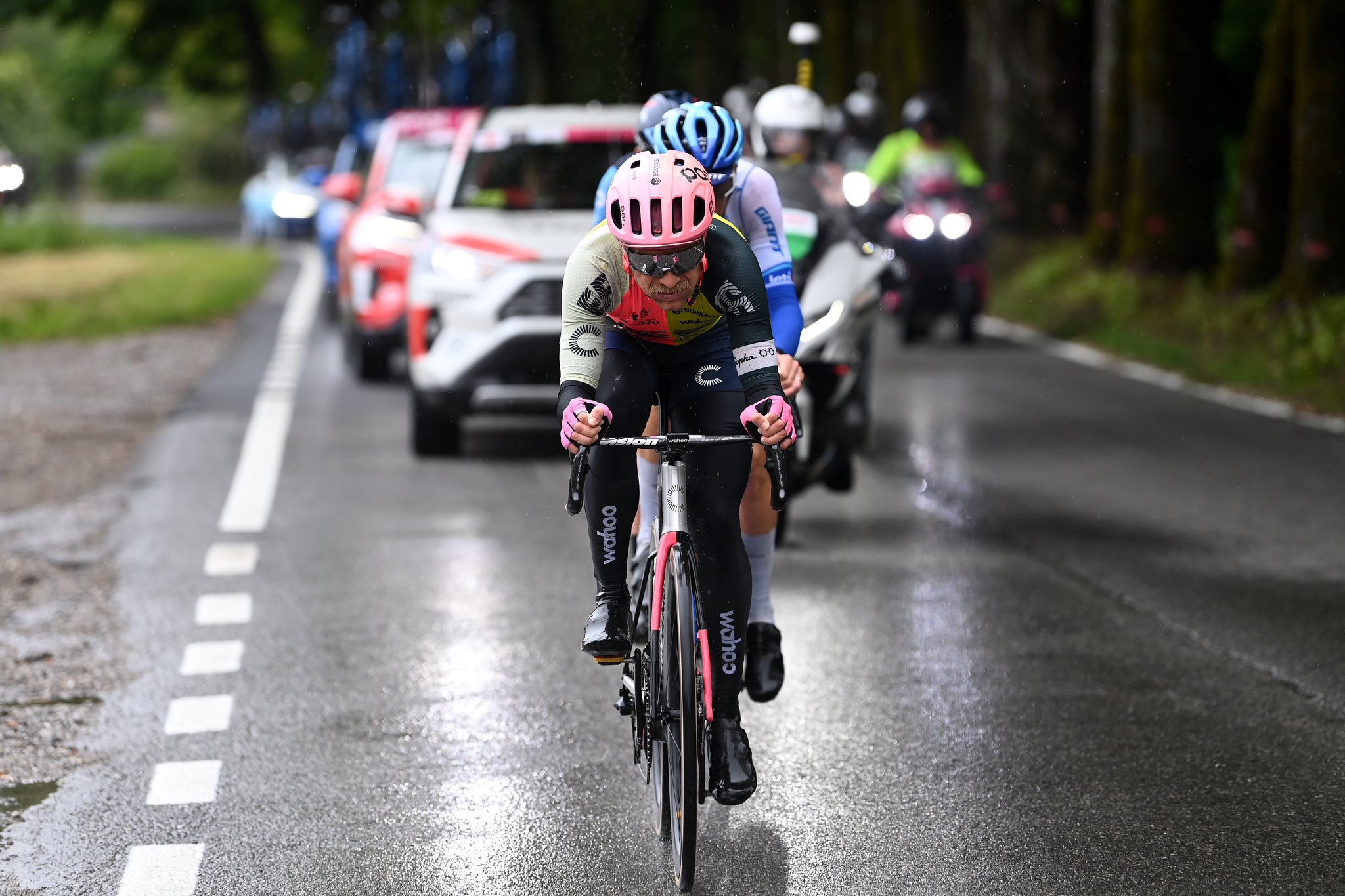 反观大集团这边,尽管帕索迪拉奇山让选手们吃尽了苦头,部分不善于爬坡选手掉队,也让一些车队试图尝试追击前方突围选手,比如巴林车队派三人追击。但是各车队有意控制节奏,等掉队选手接回后一起追击前方的选手并成功收回巴林车队的追击选手。大集团前方由英力士和珍宝两支总成绩战线“控场”,意味着突围选手很有可能获胜。
