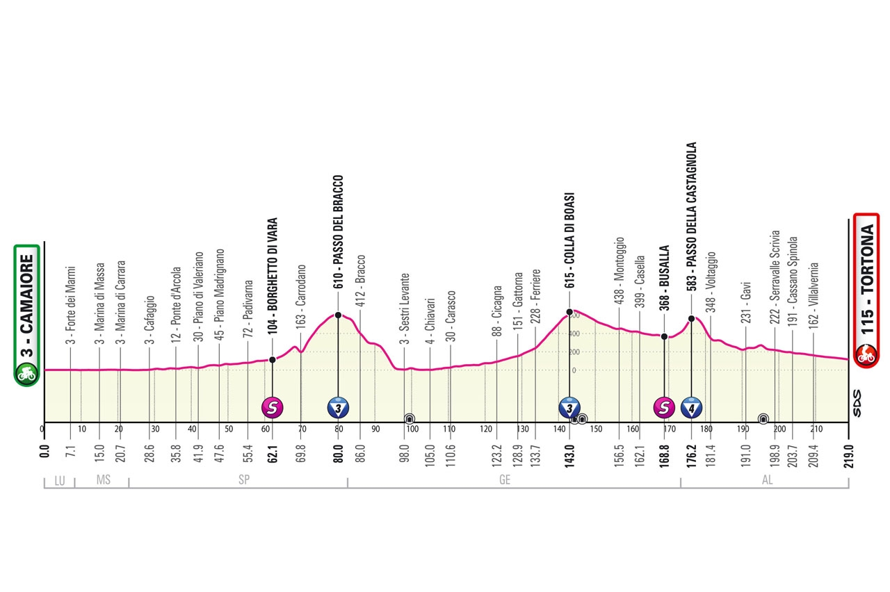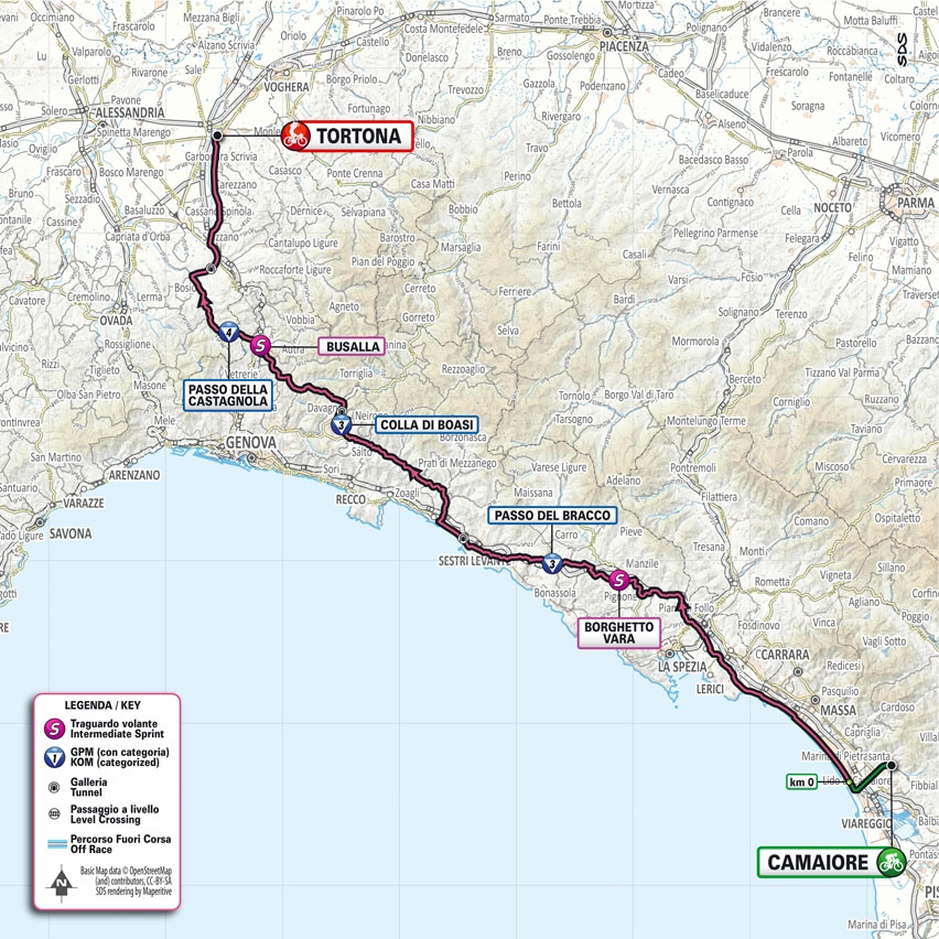 赛事路线。本场比赛赛程219公里,从卡马约雷出发一路向西北,选手们经过2个途中冲刺点和3个爬坡点,包括拉斯佩齐亚和达五渔村后,沿着丰塔纳布奥纳河谷向北穿过热那亚和博阿西(第二个冲刺点)后向北骑行。最后30公里道路笔直且有下坡,预计大集团在终点托尔托纳展开集团冲刺对决。