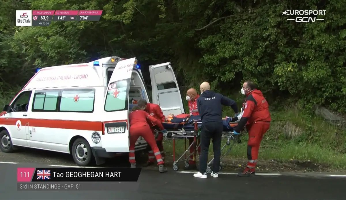 英力士折戟。在距离终点前68公里附近,此时大集团正在下坡途中一个转弯口,(阿联酋航空车队)科维控车不当引发集团内出现一波摔车,其中附近的英力士车队的托马斯和哈特以及珍宝车队的罗格里奇遭到波及,其中哈特伤势过重退赛,被迫上救护车。罗格里奇和托马斯无大碍,继续跟在大集团队尾骑行。