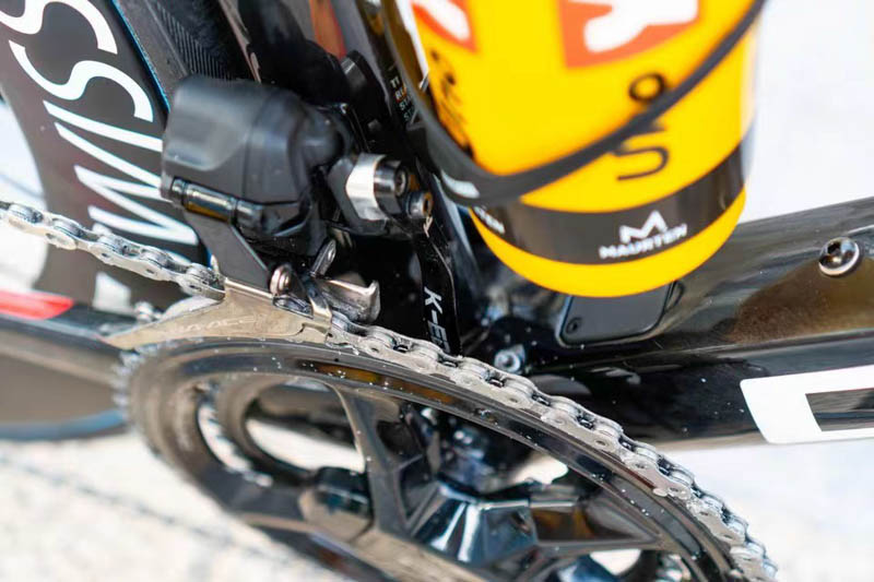 与我们见过的所有其他顶级车手一样,克里斯托夫运行的是 54/40t 齿比配置。前拨链器前面有一个 K-Edge 防掉链器,我们同样在巡回赛的一些顶级战车上都可以看见。