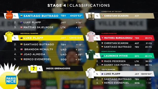 本场比赛结束后,普拉普赢得黄衫和白衫,皮蒂保有绿衫,布尔加多保有圆点衫,3月7日举行巴黎-尼斯S5(索沃尔——西斯特隆),敬请期待。