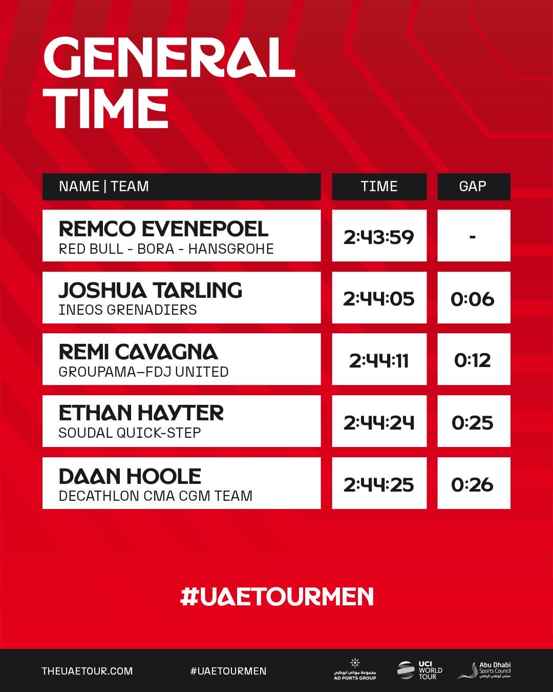 随着最后一位发车的德尔托罗(阿联酋航空车队)发车,他的计时赛能力在队内并不突出,最终以13分45秒成绩完赛,赛后他将让出总成绩领先的红衫给埃菲内普尔。