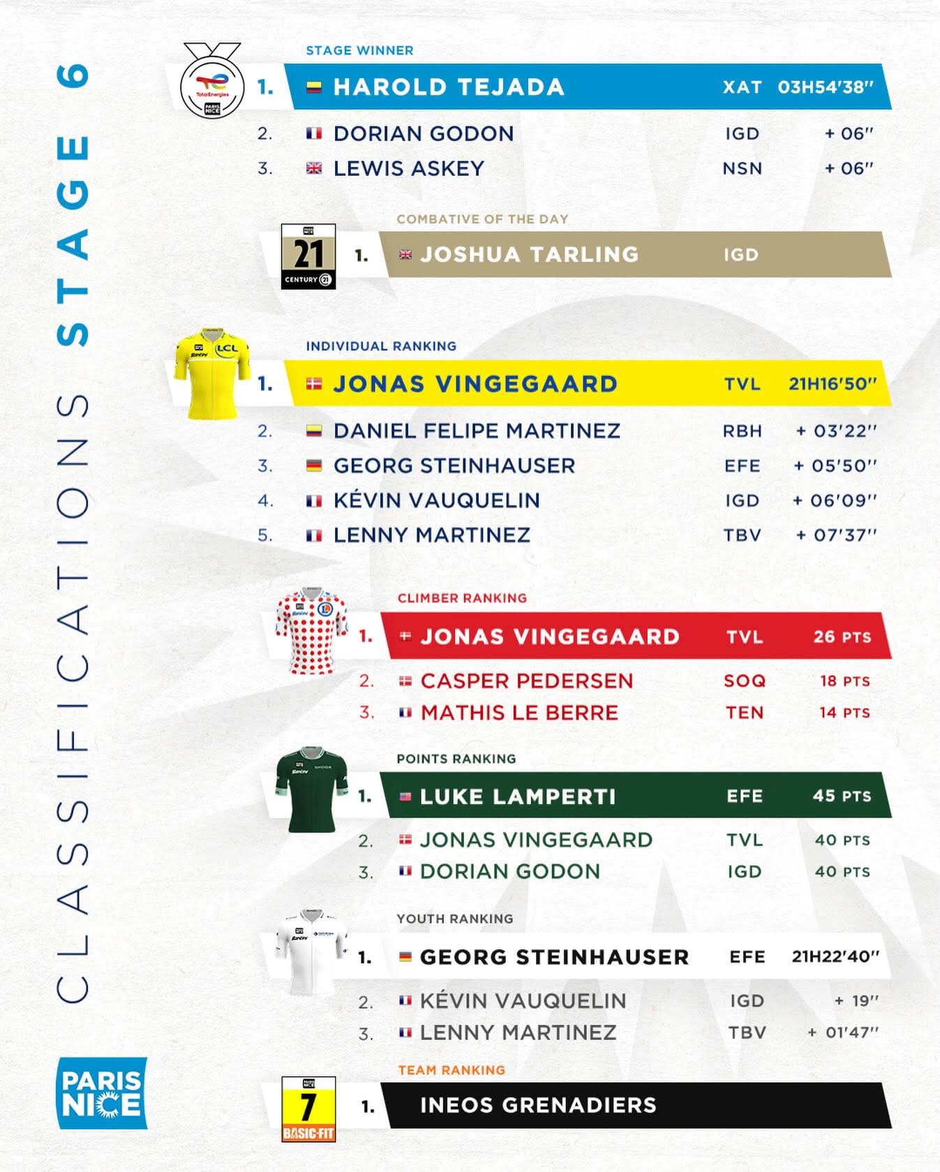 比赛结束后,温格高赢得黄衫、圆点衫,兰帕蒂赢得绿衫,斯泰因豪斯赢得白衫,3月14日举办巴黎-尼斯S7(尼斯—阿隆山),比赛全程138.7公里,各支车队总成绩主将将会在阿隆山展开总成绩最后一搏,敬请期待。