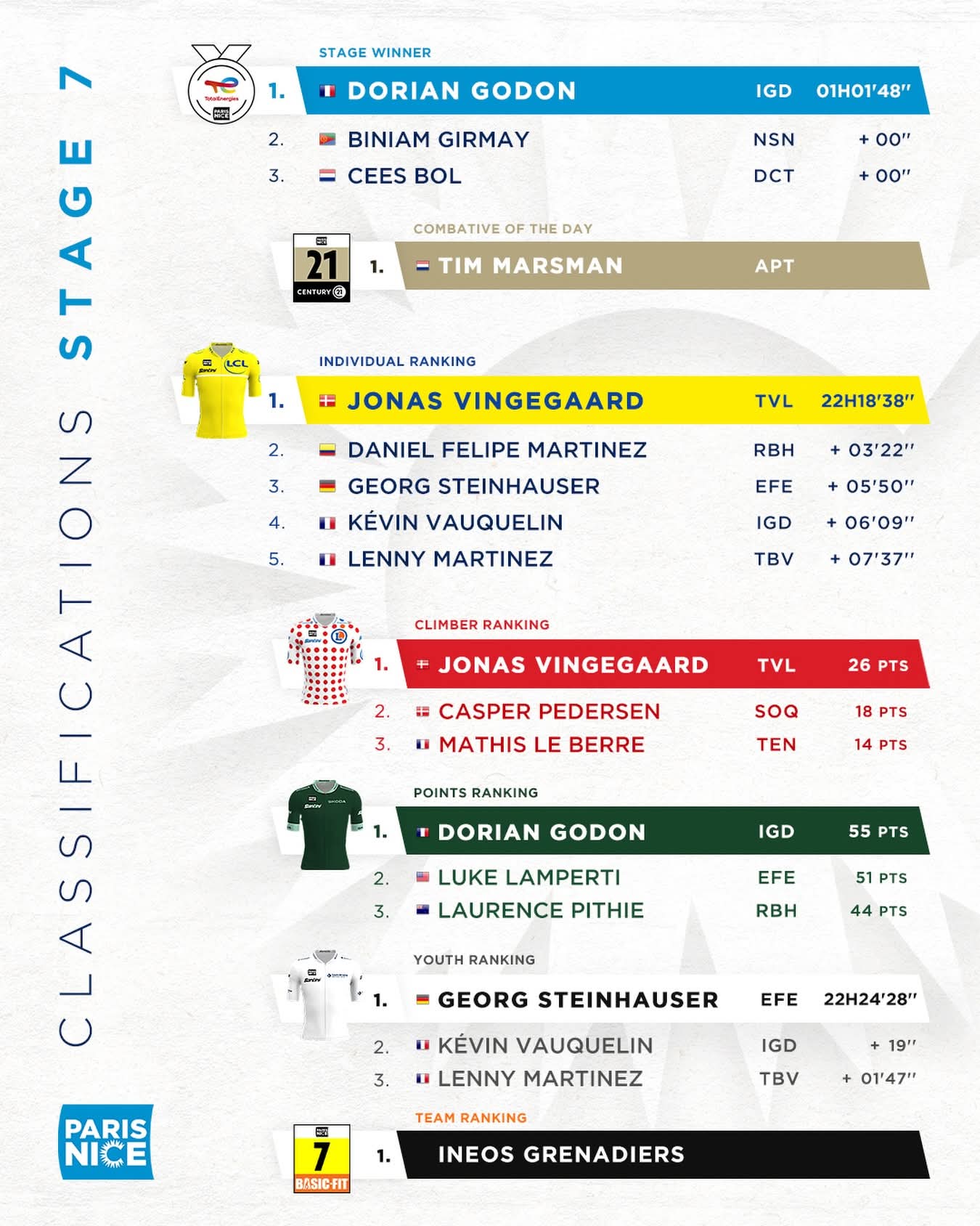 比赛结束后,温格高赢得黄衫、圆点衫,戈登赢得绿衫,斯泰因豪斯赢得白衫,3月15日举办巴黎-尼斯S8(尼斯绕圈赛),比赛全程129.5公里,各支车队将会展开收官之战,维斯马车队也将再次捧起总冠军奖杯,敬请期待。