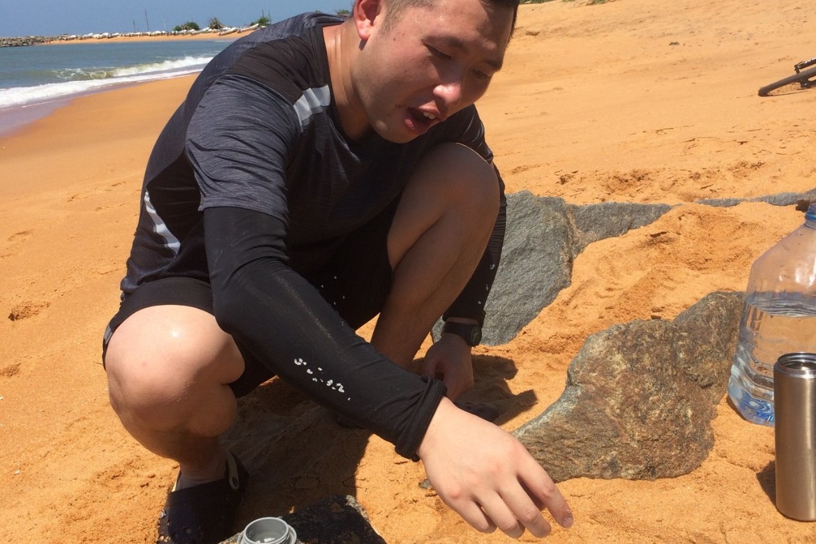 图中的小哥就住旁边,看到我们烤鱼,给我们拿来了盐、淡水和酒,让我们好好地享受这美丽海滩上的美味烤鱼。我们实实在在感受到了当地人的热情。可惜他一句英语不会,全程靠手势交流,这正合我意(因为英语极烂无比)。