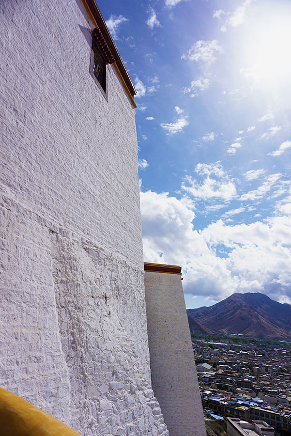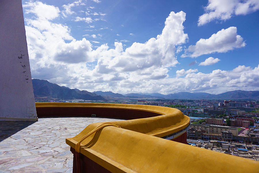 扎寺的展佛台,西藏黄教各大寺院绝无仅有,是扎寺一大特点。还有一景观,那就是众多无主的狗皆聚于此,还有羊、鸡等,悠闲晒太阳,与人和平相处。我对寺并无多大兴趣,所以不需买票的话倒可以去看看,若要票,无地可去才会去。当天傍晚与昆明骑者吴岱泉一起出去吃饺子,回来时他说:听说日喀则有个小布达拉宫,不知道在哪?我一抬头,越过街道两侧房顶,远远看到一座小山头上有一建筑,颇像布达拉宫,就指给他看:那里可能就是吧。