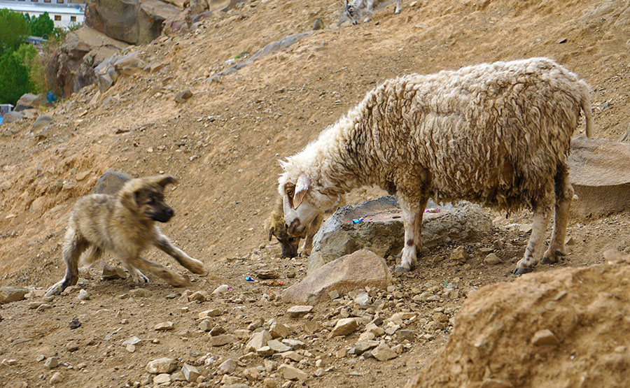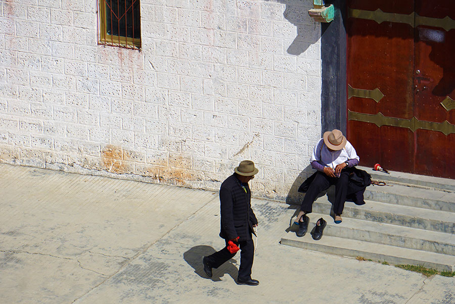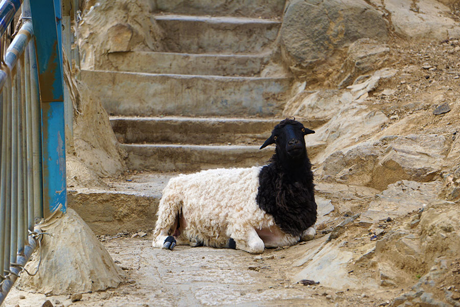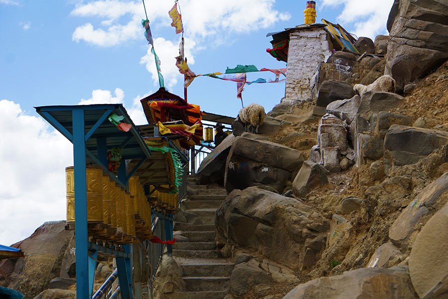 老人们见到我多微微一笑。有些年轻人在转经路上拾着垃圾。经幡,经筒,玛尼石……还有就是狗和羊,很多。有的羊全身披挂,安静而慈祥地望着人们对它叩拜。路上的羊很礼貌,知道给人让路。那些睡觉的狗则不管这些,四脚八叉躺在路上,人的脚有时需要插到它的缝隙间过去,它们则连眼皮都不眨一下。一个藏族妇女正在喂一条狗,她冲我笑:‘这是一条瞎狗啊,不喂,会饿死的。”一个盲人坐山脚一棵树下弹唱,这就是有名的西藏弹唱,把我吸引,我坐在他的旁边,闭上眼,静静地感受这天地间似乎从远古来的奇妙声音。