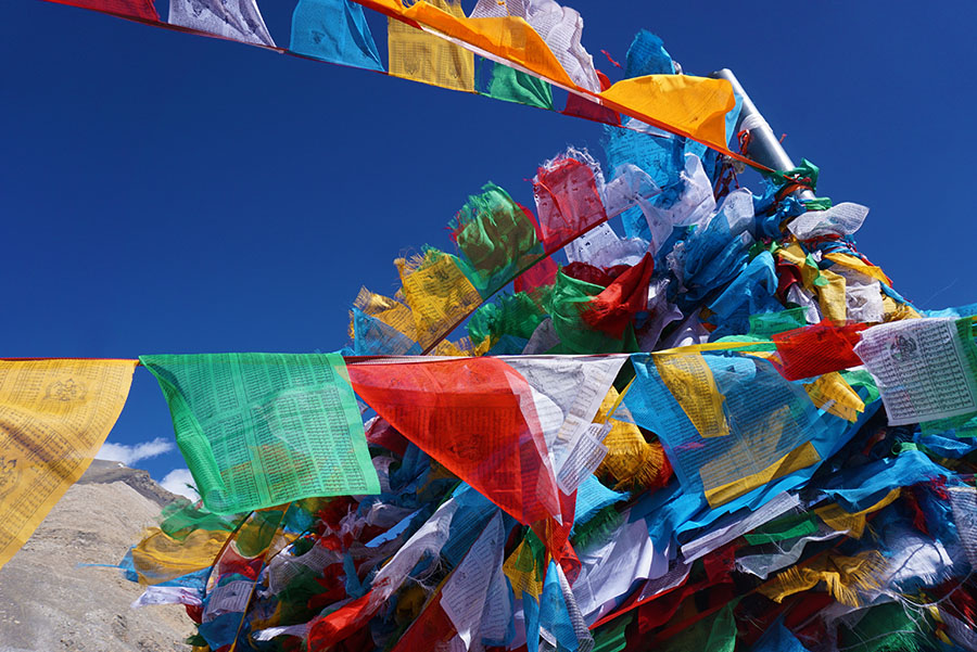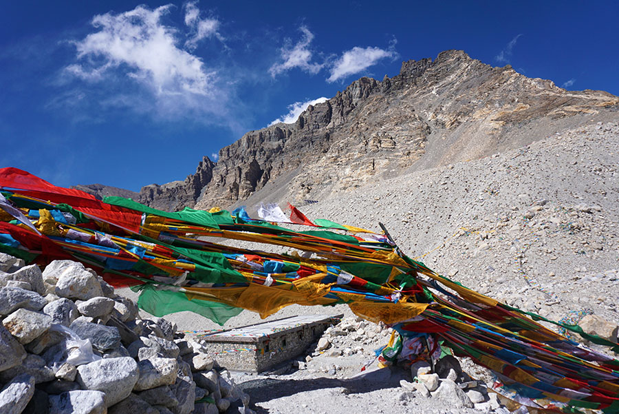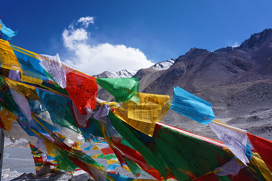 这里是观景台,经幡猎猎,目光越过一片山坳,珠峰巍然屹立。雪山。