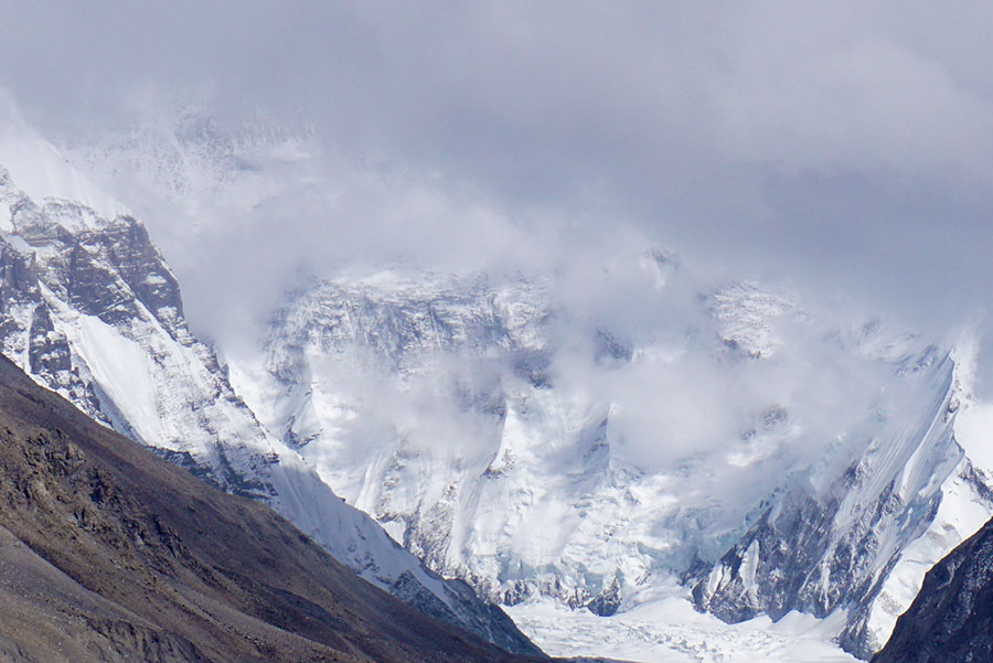 云层在她身边缭绕着,快速水平移动或上升,峰顶忽尔被云遮住,又忽尔露出真容,不管周围风云变幻,珠穆朗玛峰,岿然不动。