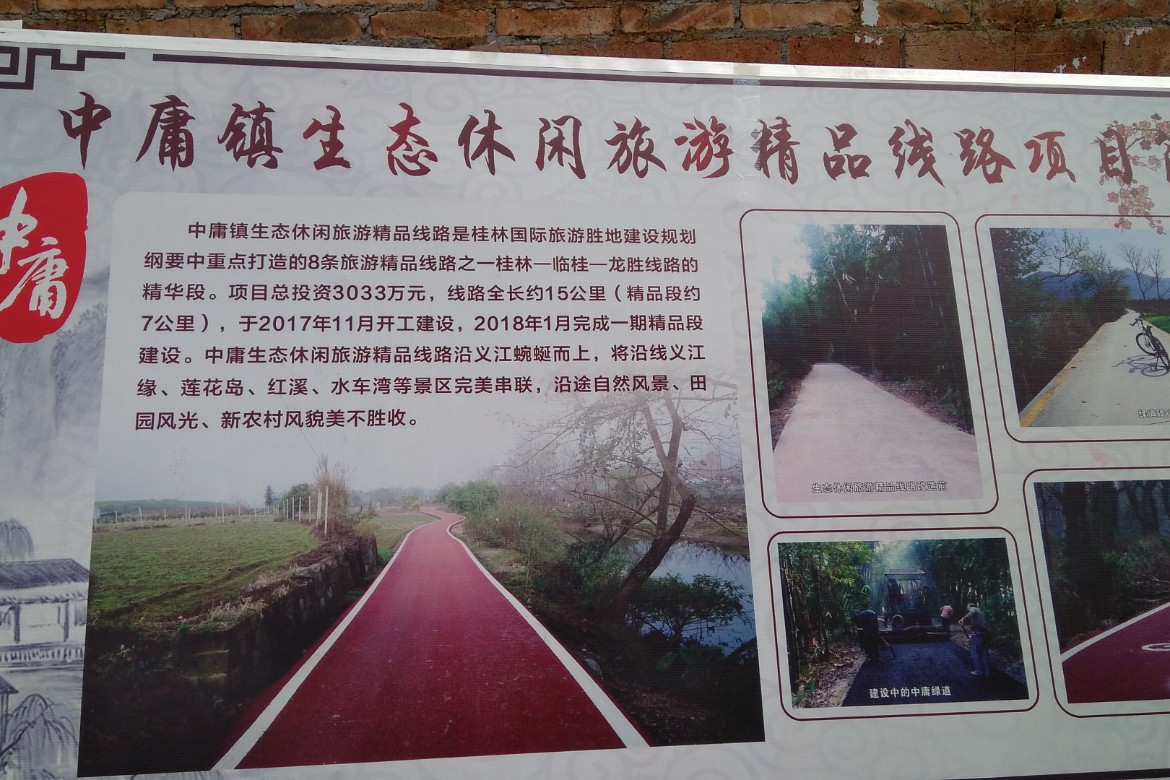 沿着绿道继续前行,看见政府告示牌。根据介绍,中庸绿道已建成8公里(一期)、二期工程(正在建设) 向宛田延伸,未来远期规划通向龙胜。如果真能完成这项大工程,那么未来骑单车去龙胜更安全、省力。