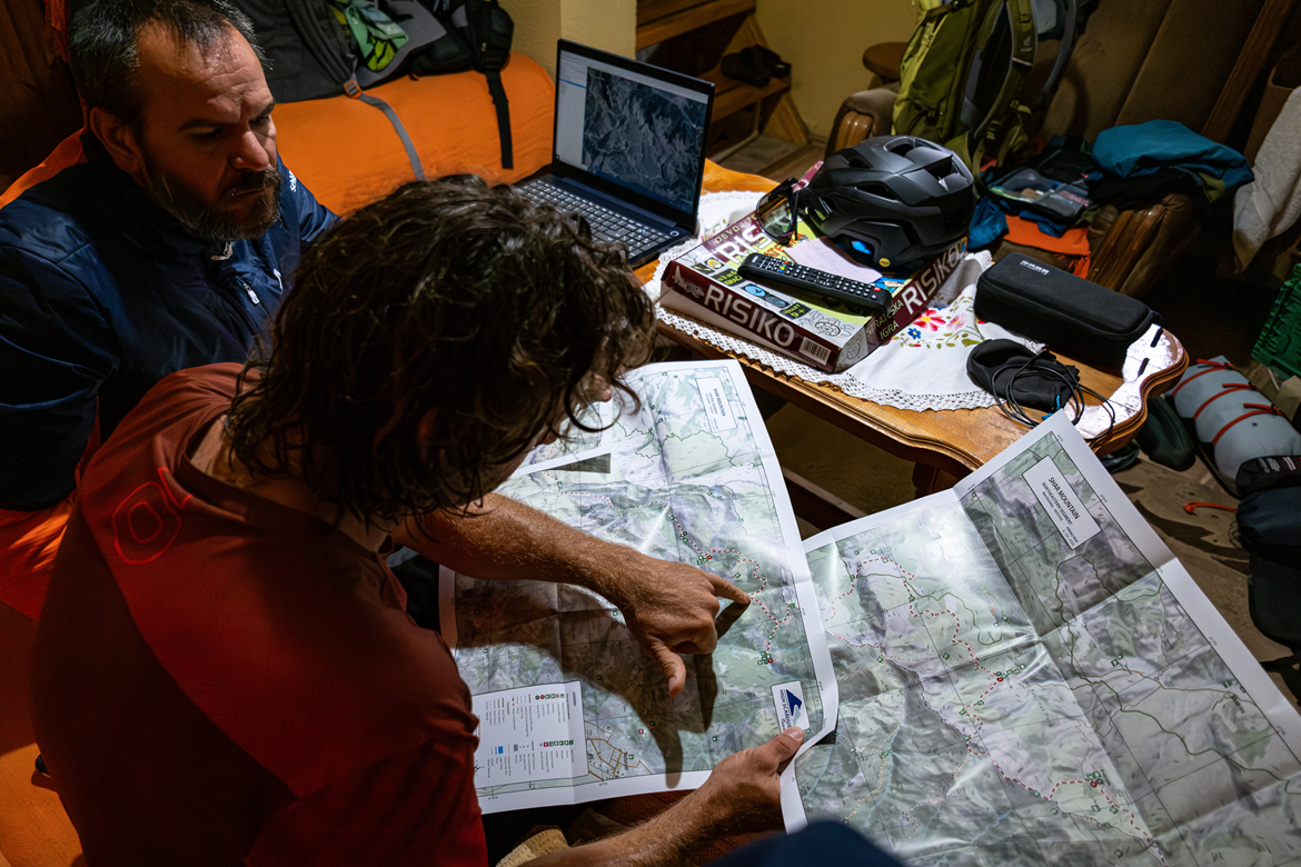 斯托扬在地图上指着一个村庄:"拉布迪什特。我们两天后到那里,去那里的路看起来像是专门为山地自行车修建的。但首先我们要沿着山脊上的一条小径,翻越一个小山口。在阿尔巴尼亚一侧,我们注意到一个突出的带状痕迹。