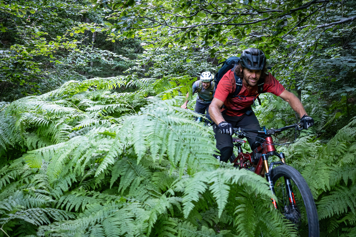 但黑暗很快迫使我们打开了头灯,不久之后,漆黑的森林将我们吞噬。起初小径还能辨认,但很快就完全被植被覆盖。一把砍刀可能比自行车更有用。要不是斯托扬对该地区的了解,他在灌木丛中勇敢地开路寻找小径的痕迹,我们早就完全迷路了。