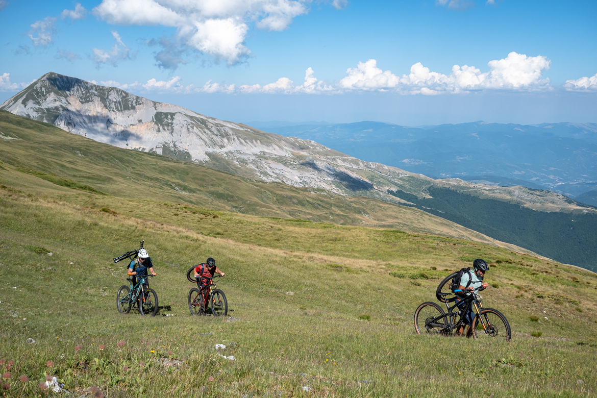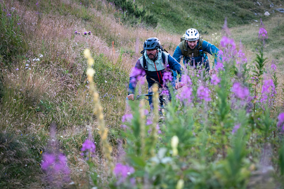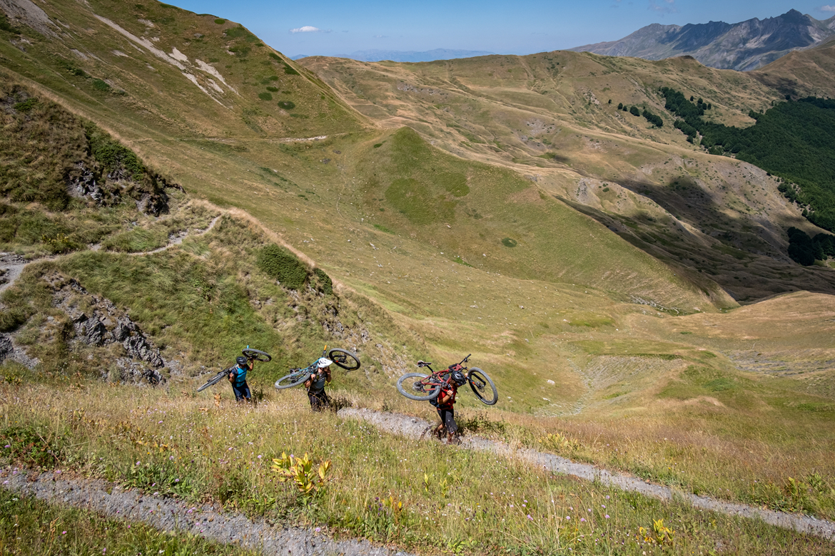 我们再次乘坐穿梭车上行一段距离,到达一个高山牧场。在这里我们不得不把自行车扛在背包上,因为通往边境山脊的路太陡,无法骑行。